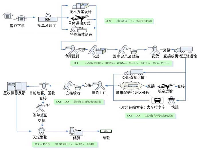 接到訂單后(下單時(shí)間不超過(guò)下午15點(diǎn),緊急訂單截止到17點(diǎn))將信息反饋給項(xiàng)目組,由運(yùn)作人員協(xié)調(diào)承運(yùn)商、安排運(yùn)輸計(jì)劃、準(zhǔn)備相關(guān)車輛或設(shè)施設(shè)備及單據(jù)、并預(yù)先制冷,如需特制設(shè)備的,公司組織安排生產(chǎn);